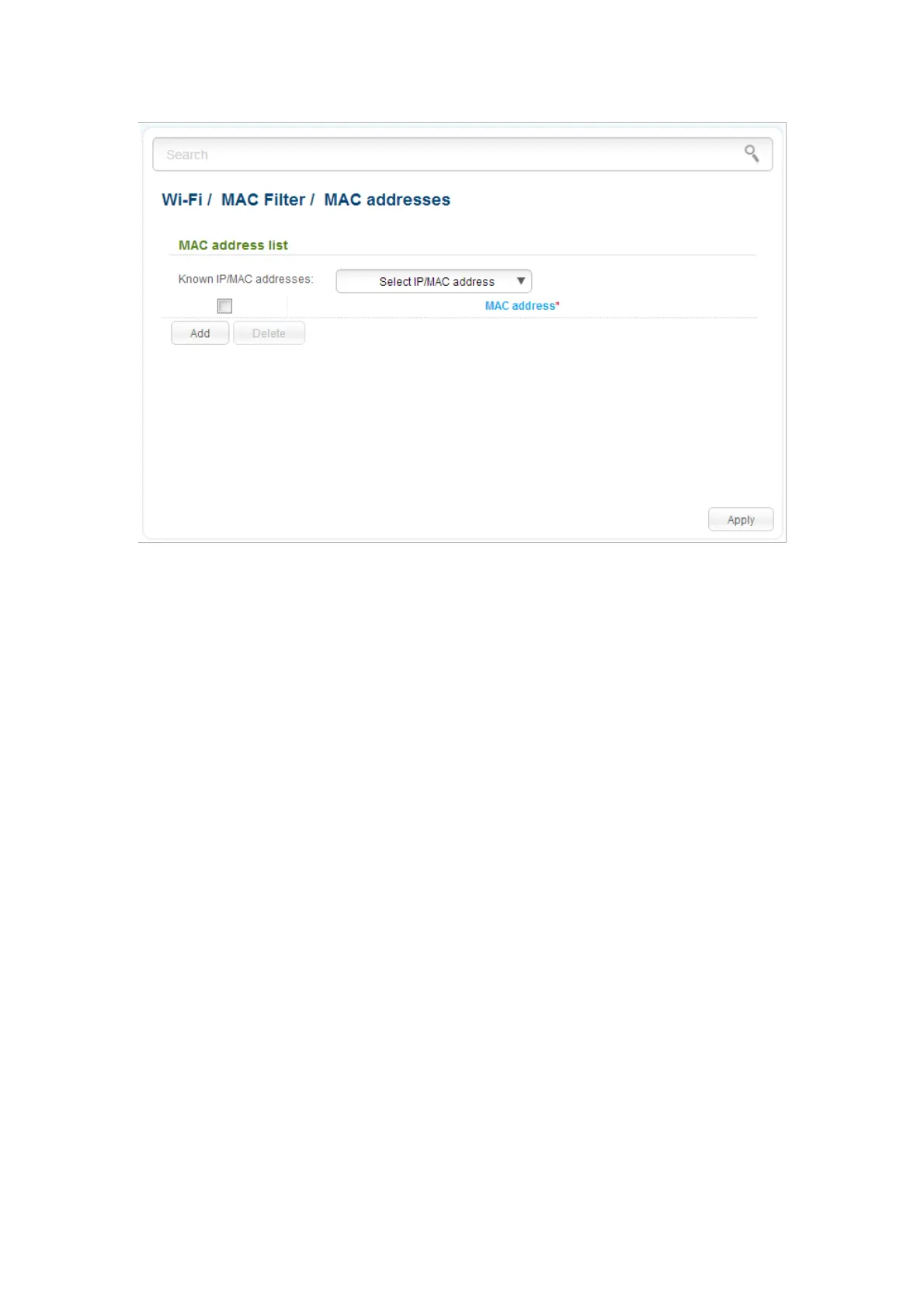 of the relevant MAC address and click the Delete button. Then click the Apply button.