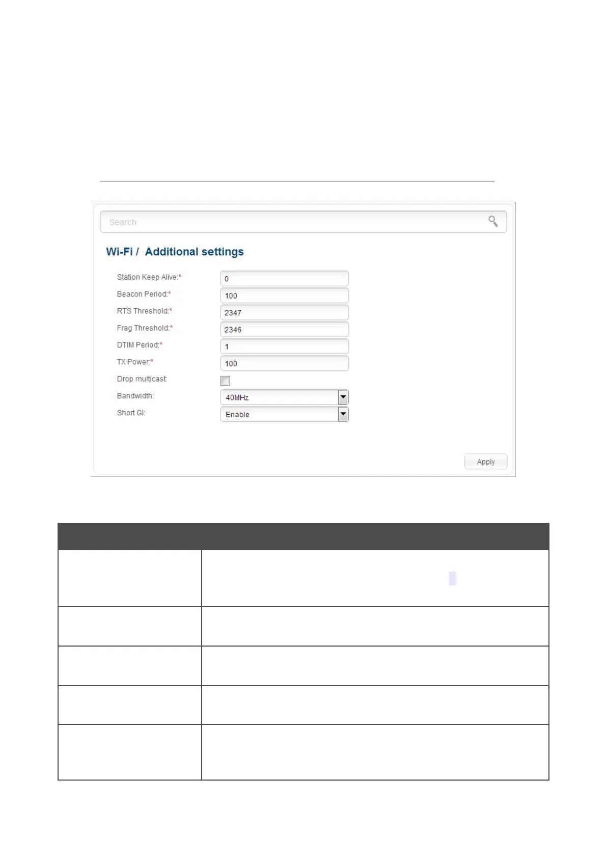 On the Wi-Fi / Additional settings page, you can define additional parameters for the WLAN of