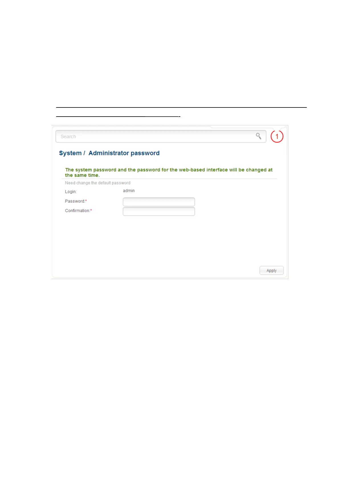 Enter the new password in the Password and Confirmation fields and click the Apply button.