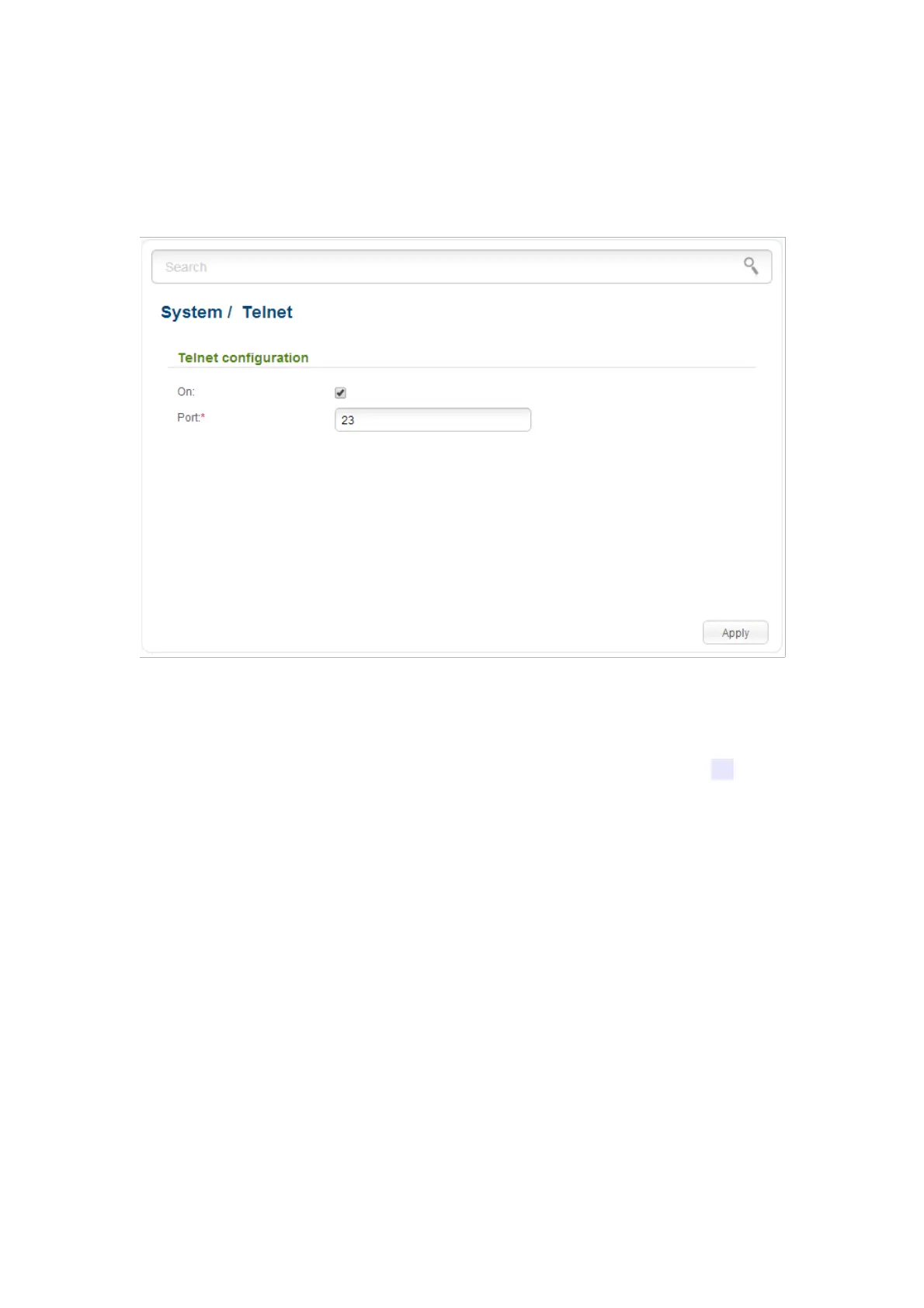 To disable access via TELNET, deselect the On checkbox and click the Apply button.