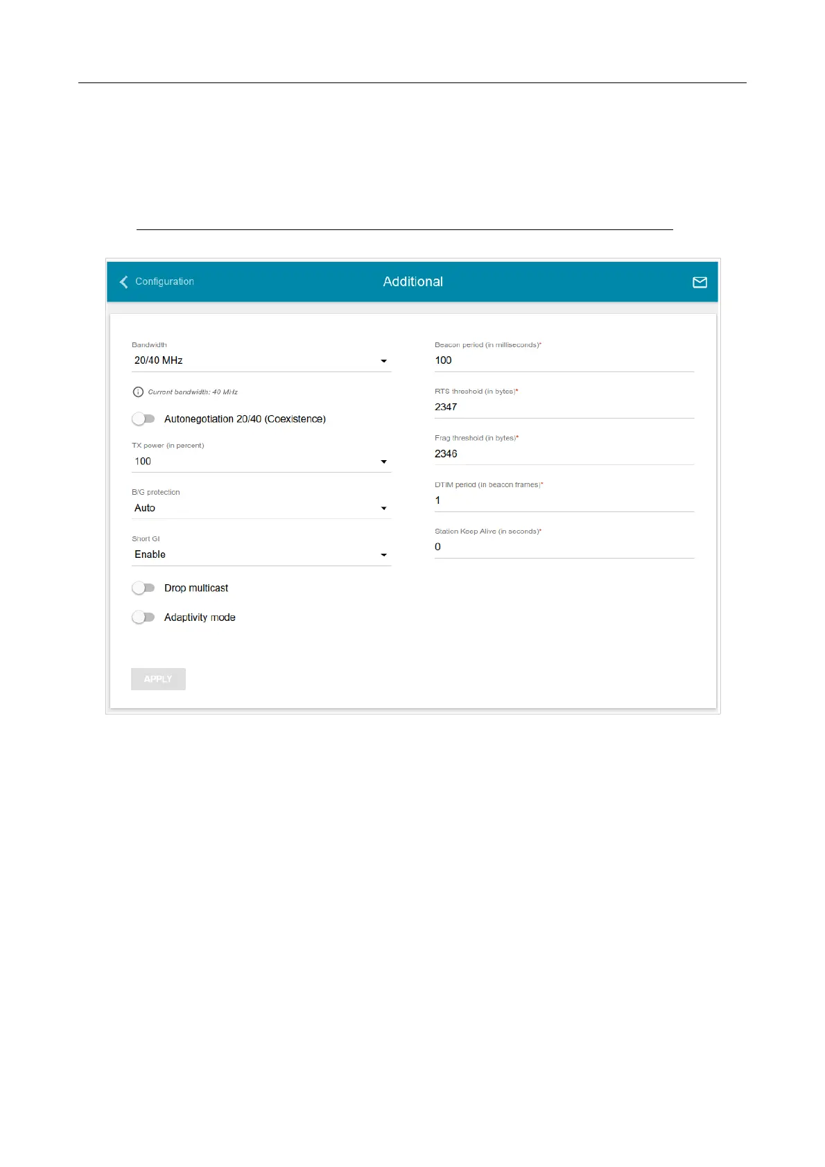 On page of the Wi-Fi / Additional section, you can define additional parameters for the WLAN of