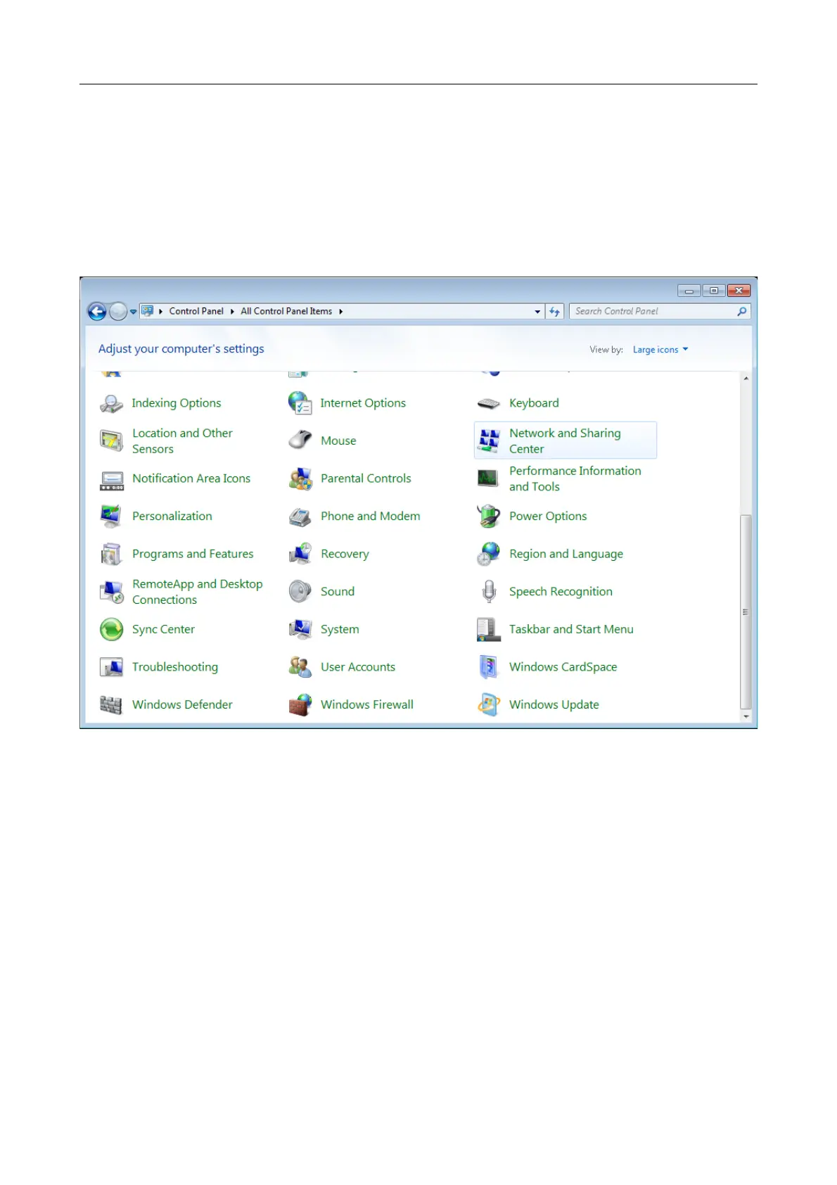 2. Select the Network and Sharing Center section. (If the Control Panel has the category