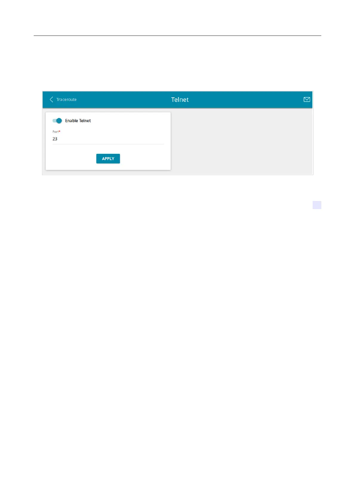 To enable access via TELNET, move the Enable Telnet switch to the right. In the Port field, enter