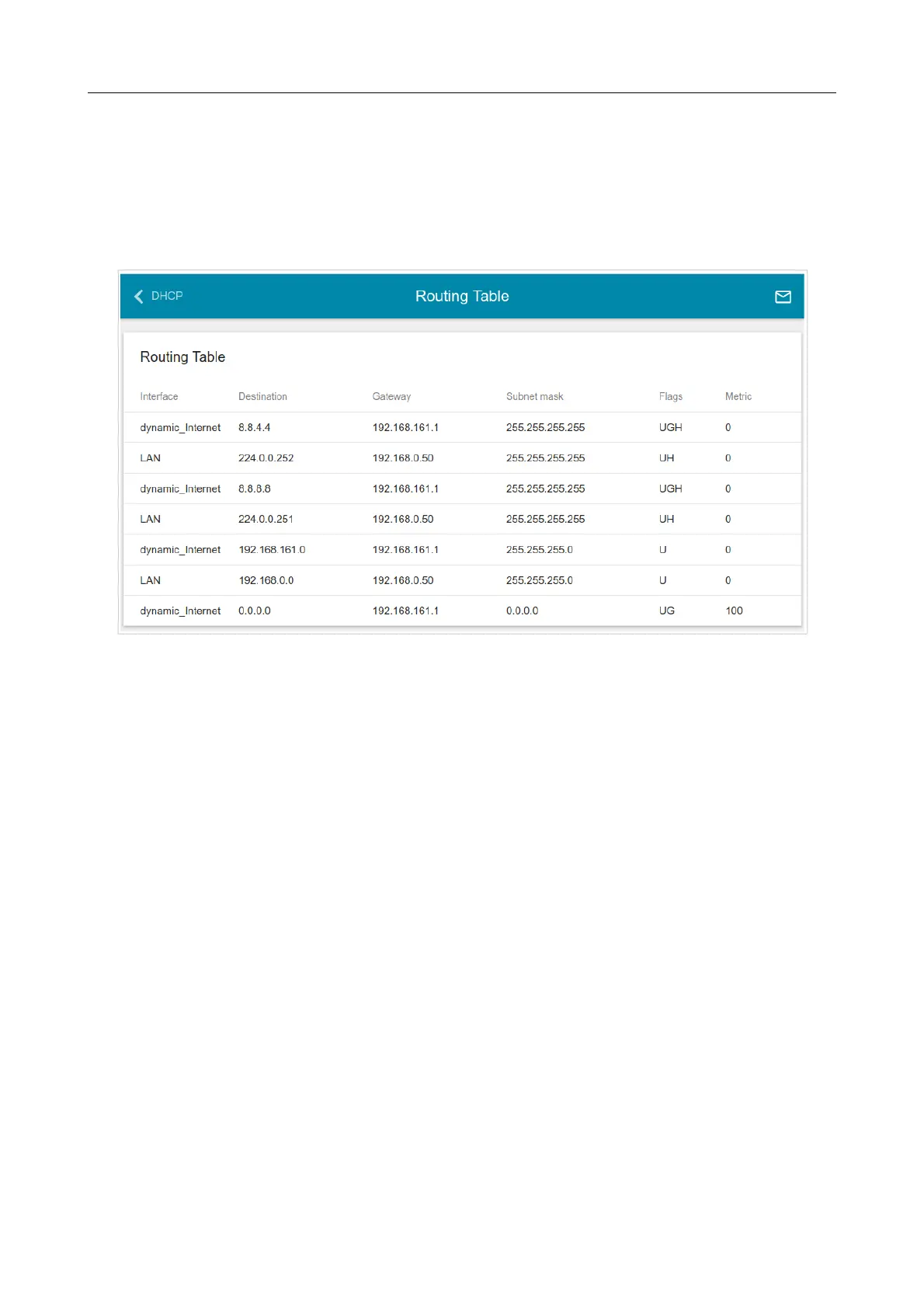 The Statistics / Routing Table page displays the information on routes. The table contains