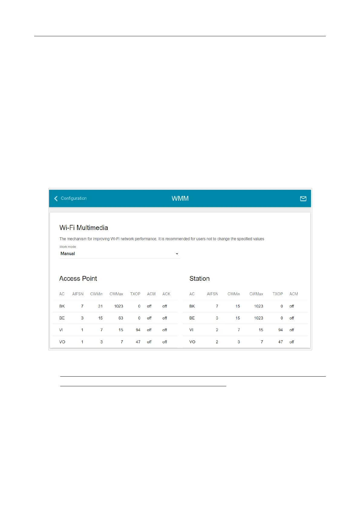 • Manual: the settings of the WMM function are configured manually. When this value is