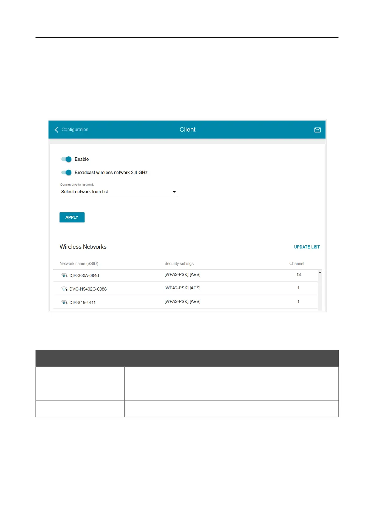 To configure the access point as a client, move the Enable switch to the right. Upon that the