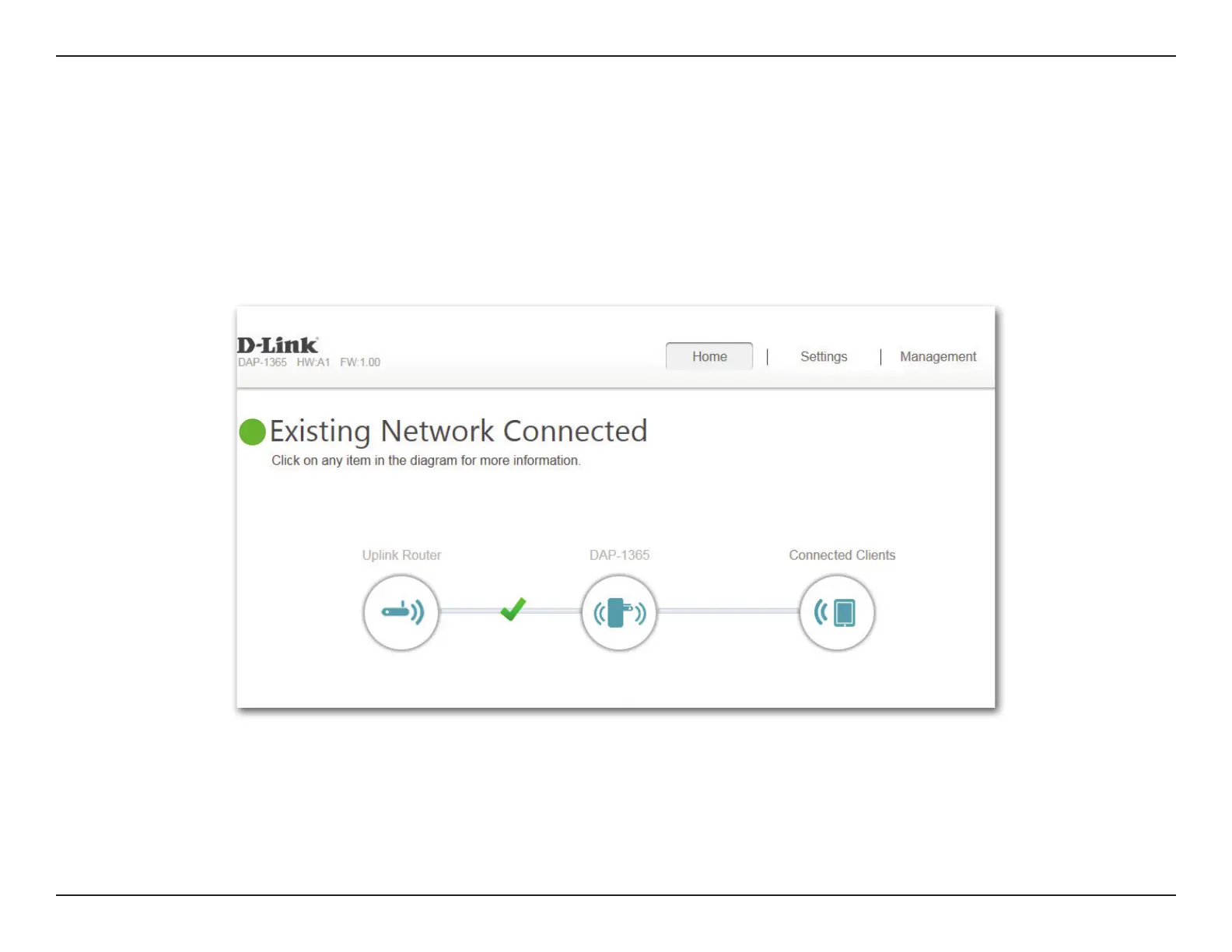 The home screen gives a summary of the current status of devices connected to the DAP-1365. A green check between the device