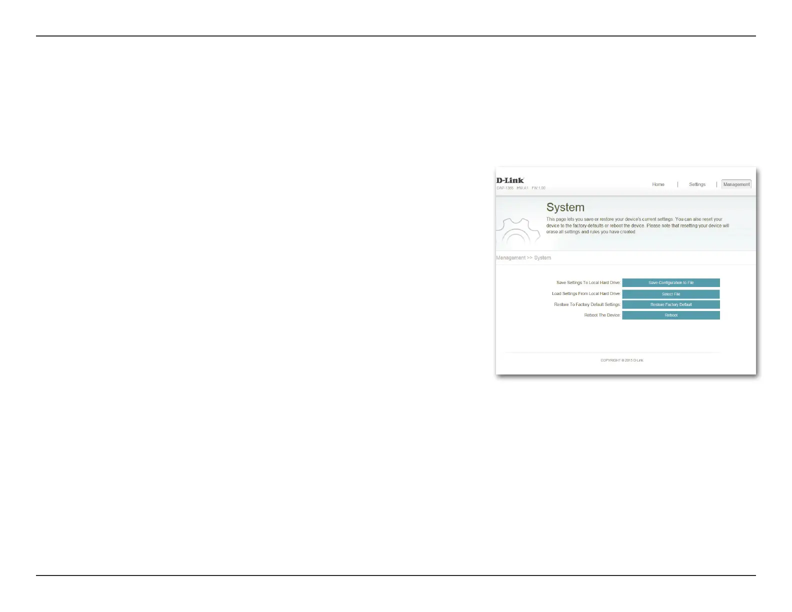 This page allows you to save or restore your system conguration, reset, or reboot the DAP-1365. To access this page, click the