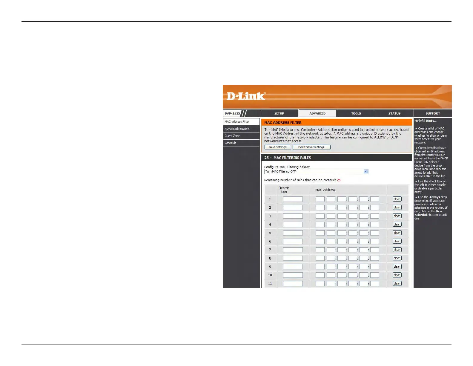 When Turn MAC Filtering OFF is selected, MAC