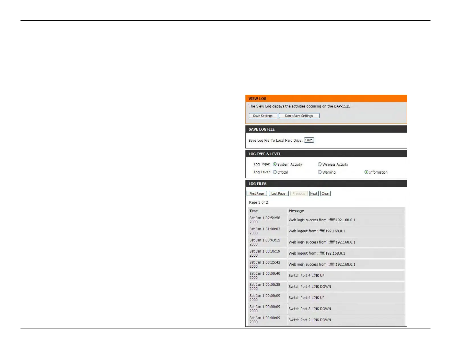 of the events to view. This access point also has external Syslog Server support so you can send the log les to a