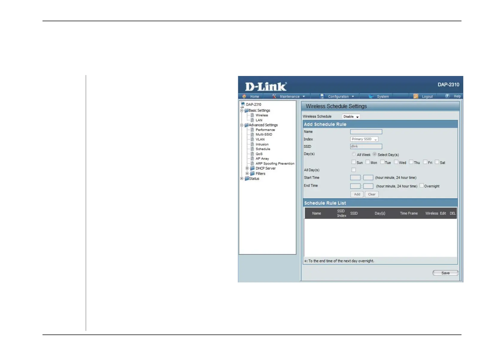 The Wireless Schedule Settings window is used to add and modify scheduling rules on the device. Click the Save