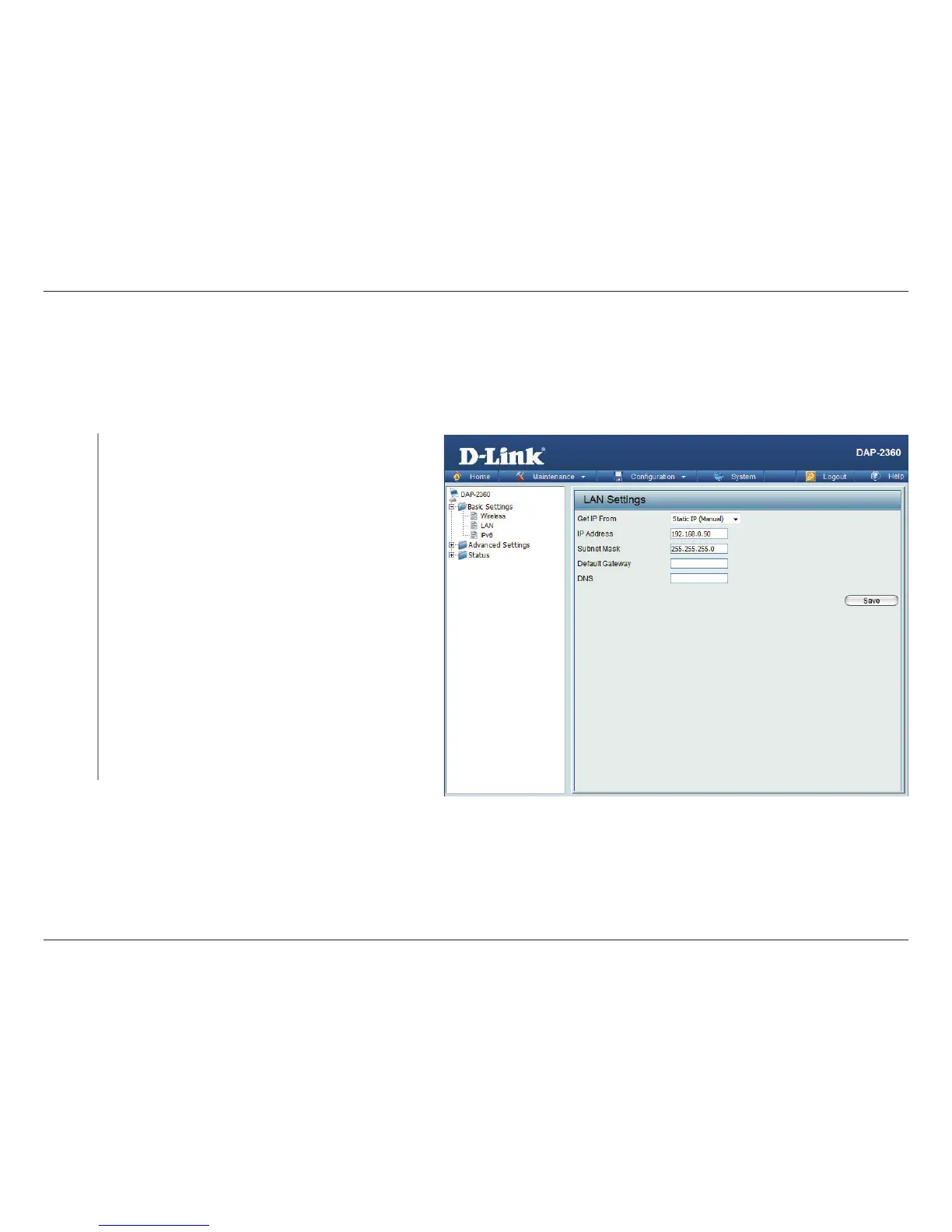 the DAP-2360. These settings may be referred to as private settings. You may change the LAN IP address if needed. The LAN IP
