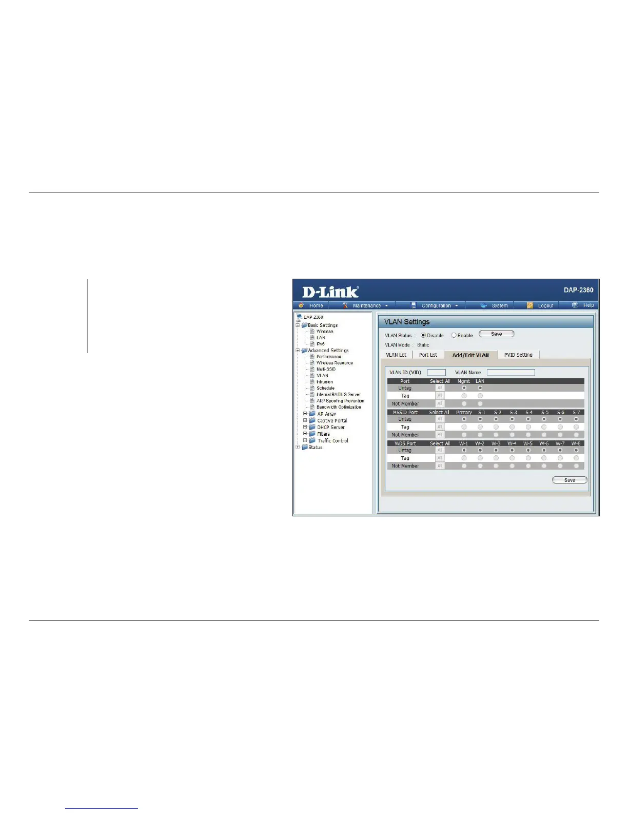 The Add/Edit VLAN tab is used to congure VLANs. Once you have made the desired changes, click the Save button to let