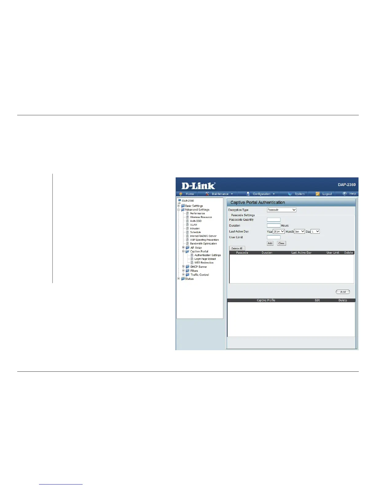 page. In this windows, user can view and congure the Captive Portal settings. Click the Add button to add a new entry. Click the Delete or Delete