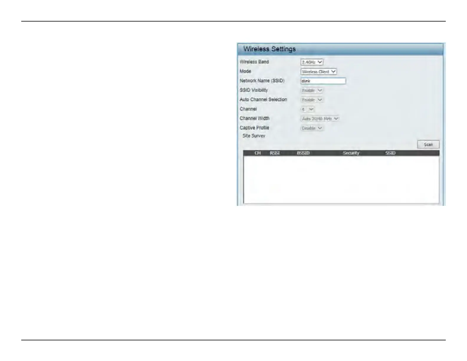Click on the Scan button to search for available wireless networks, then click on the available network that you want to connect