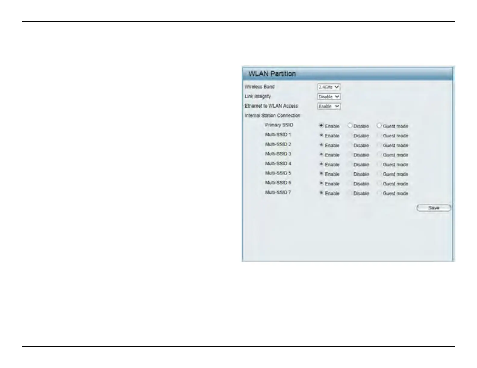 In this window, users can view and congure the WLAN partition settings. After the conguration, click the Save button to accept the changes