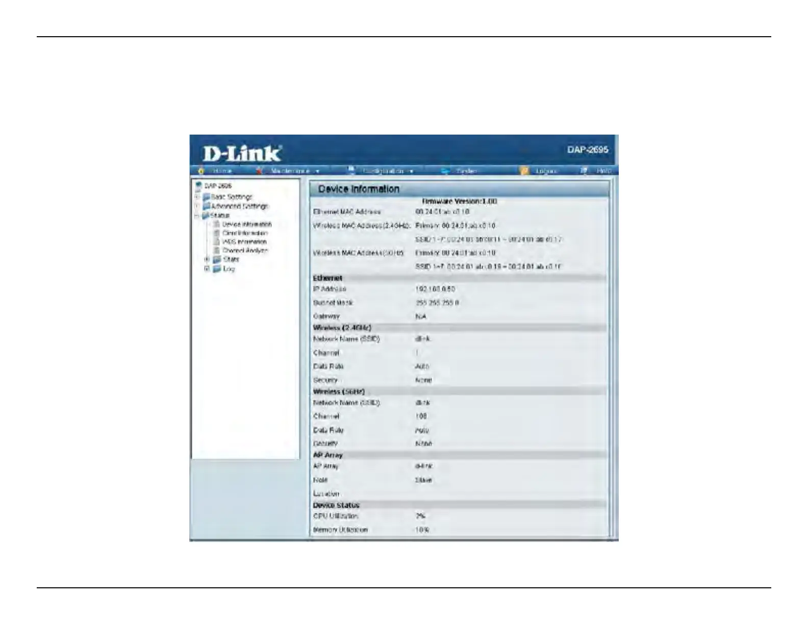 In the Status Section the user can monitor and view conguration settings of the access point. Here the user can also view statistics about client