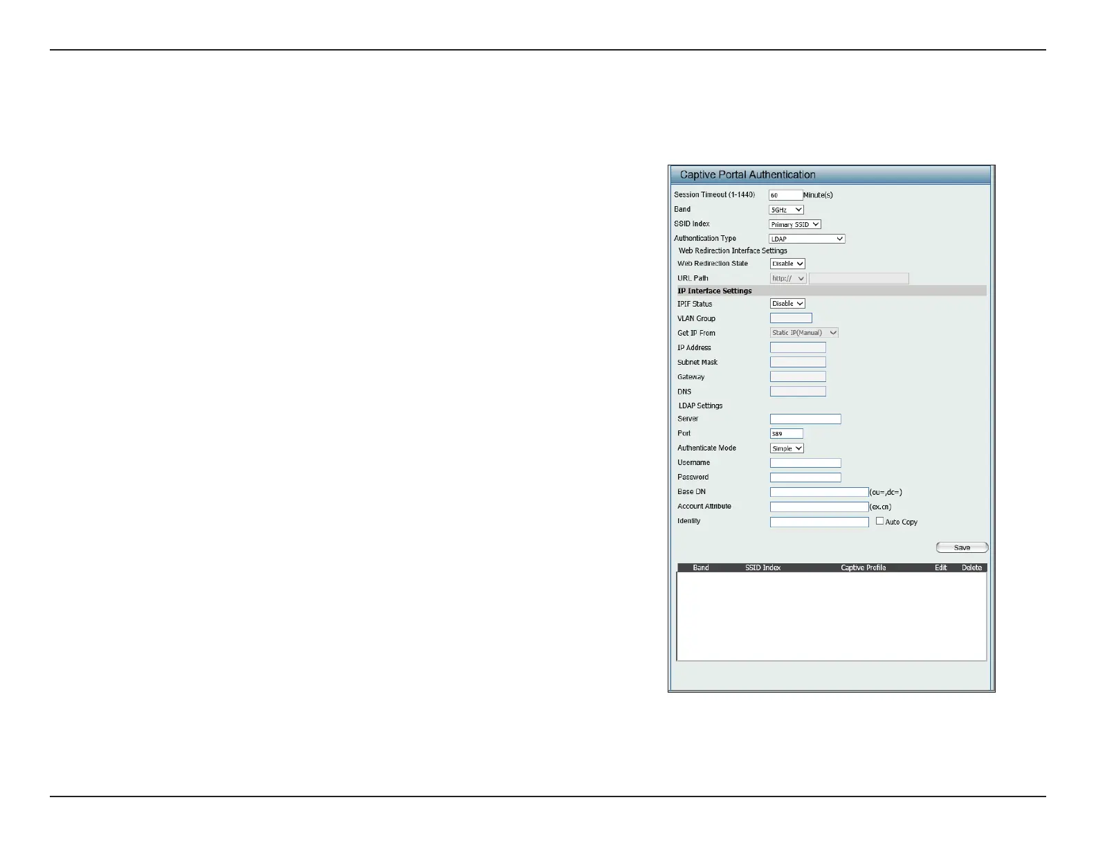 page. In this window, users can view and congure the Captive Portal settings. After selecting LDAP as the Authentication Type, you can congure