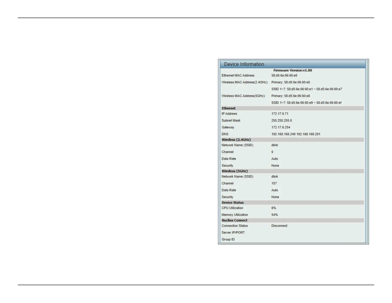 This page displays information like rmware version, Ethernet and wireless parameters, as well as the information regarding CPU and memory