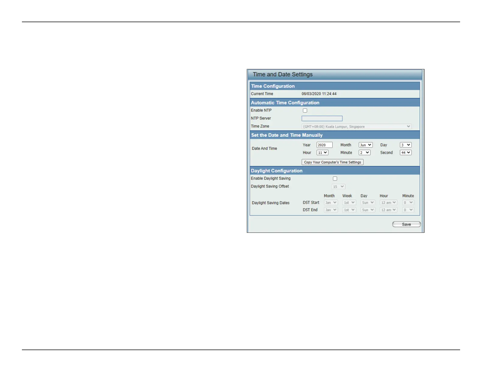 Enter the NTP server IP, choose the time zone, and enable or disable daylight saving time.