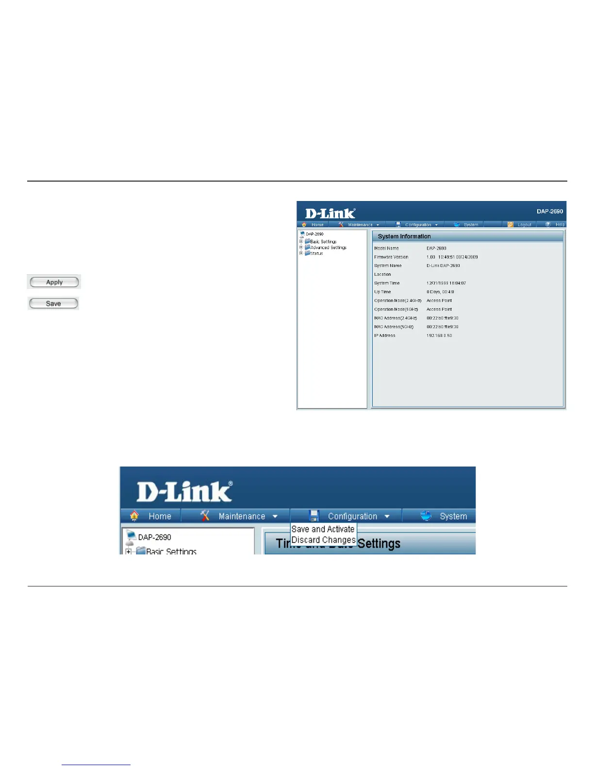 Alternatively, click the Save and Activate option on the Conguration drop-down menu at the top of each DAP-2690 window. This will cause the