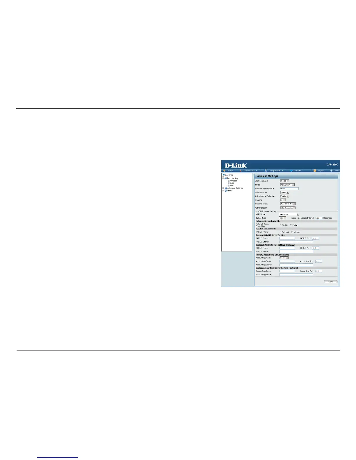In Access Point mode, the DAP-2690 functions as a wireless AP. After conguring the desired settings, click the Save button.