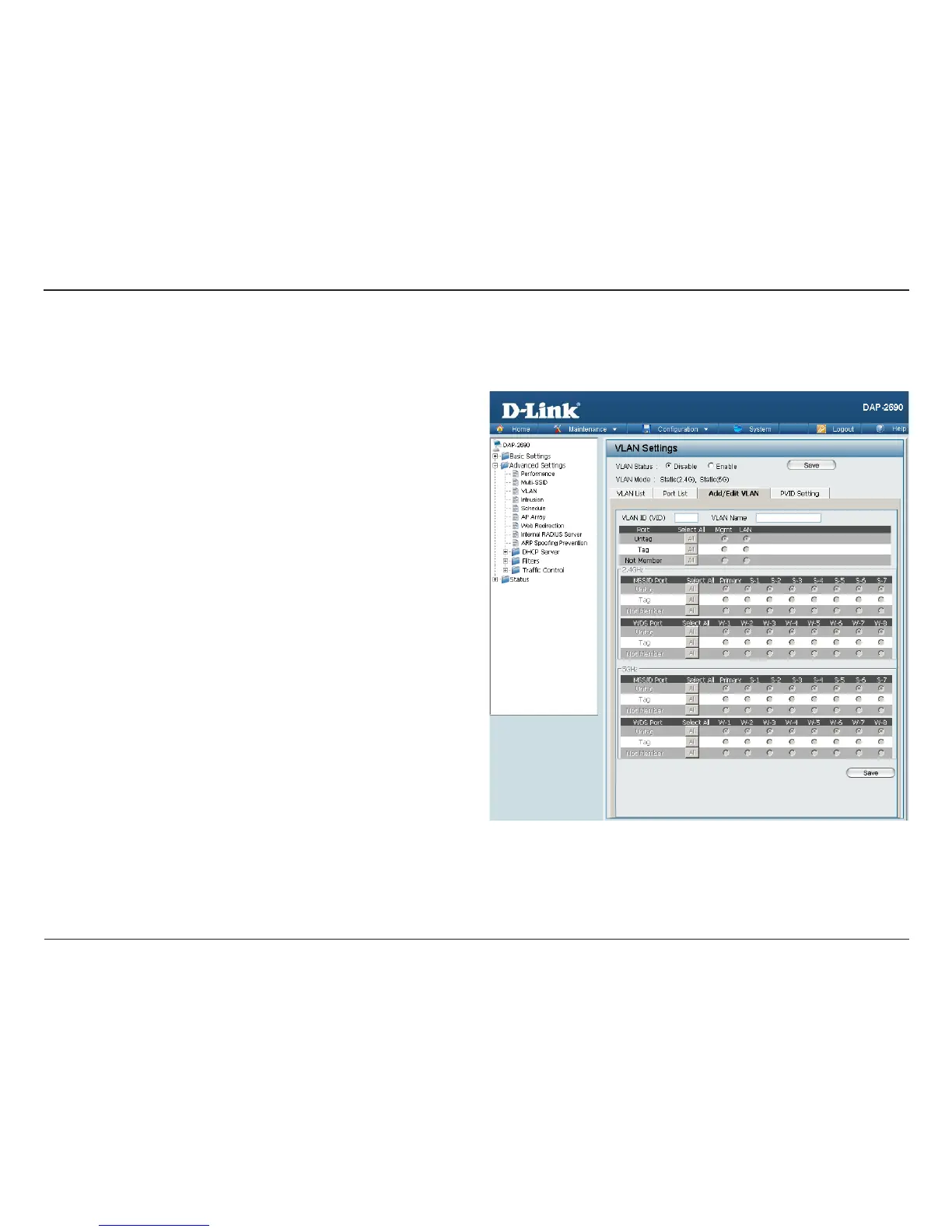 The Add/Edit VLAN tab is used to congure VLANs. Once you have made the desired settings, click the Save button to let your changes take eect.