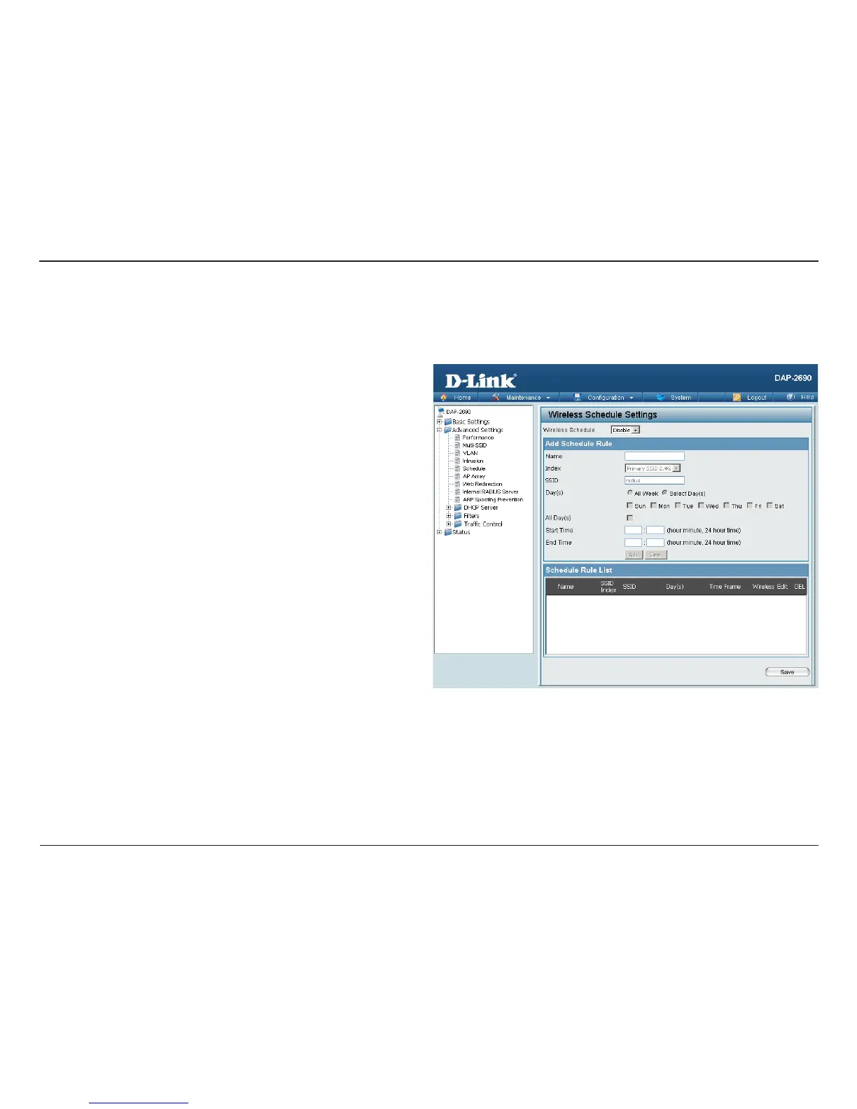 nished, click the Add button. To discard the new schedule rule settings, click the Clear button. Click the Save button to let your changes take eect.