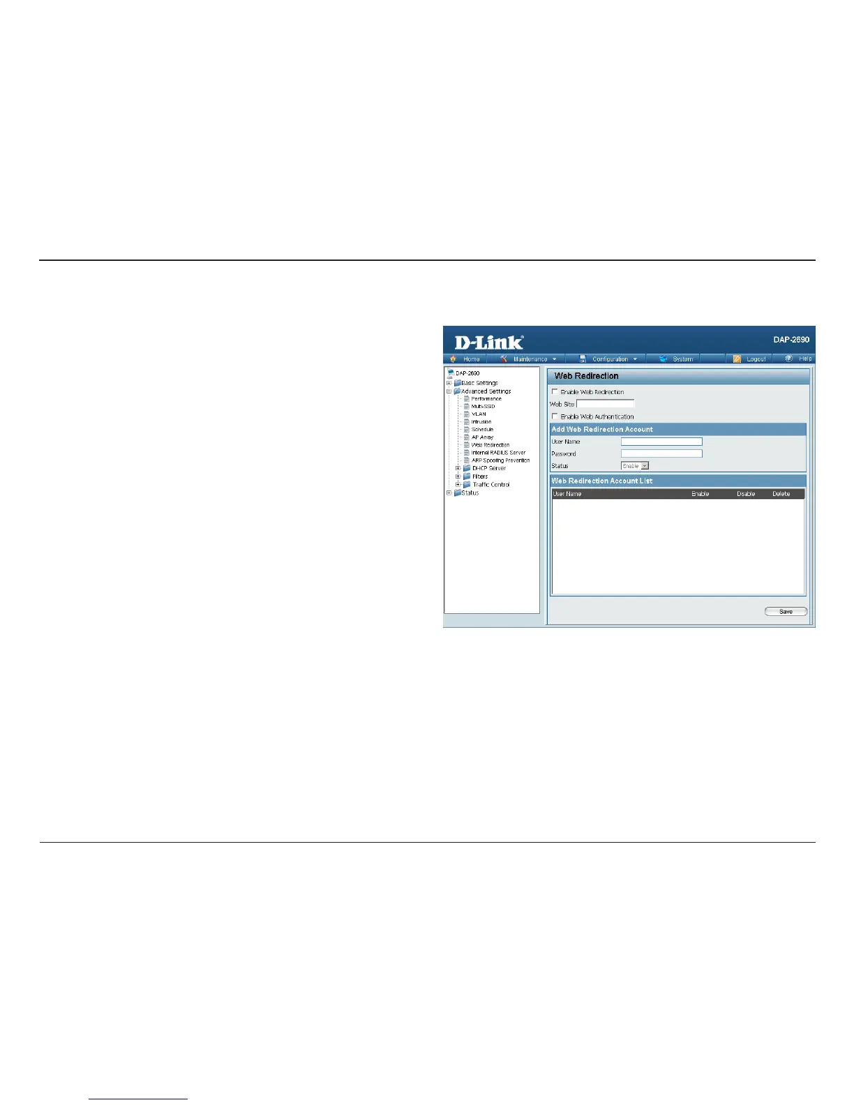 the radio buttons to enable or disable the Web Redirection