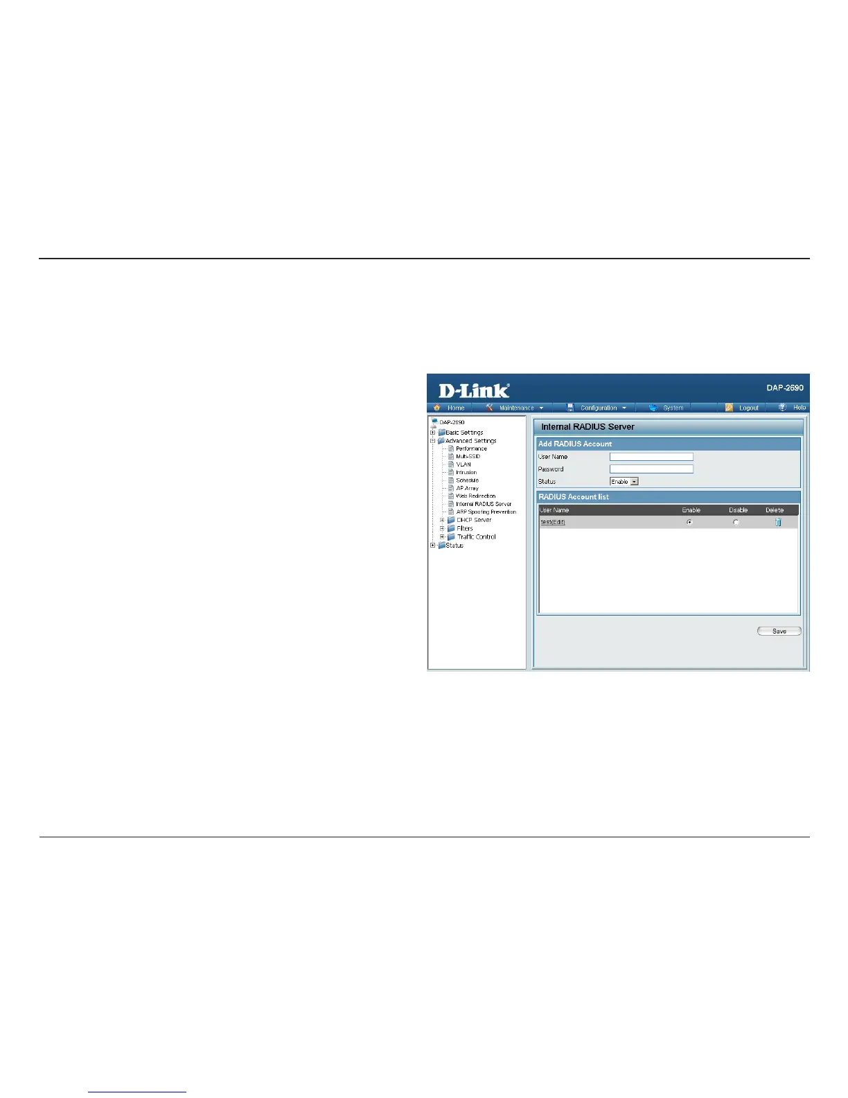 The DAP-2690 features a built-in RADIUS server. Once you have nished adding a RADIUS account, click the Save button to let your changes take