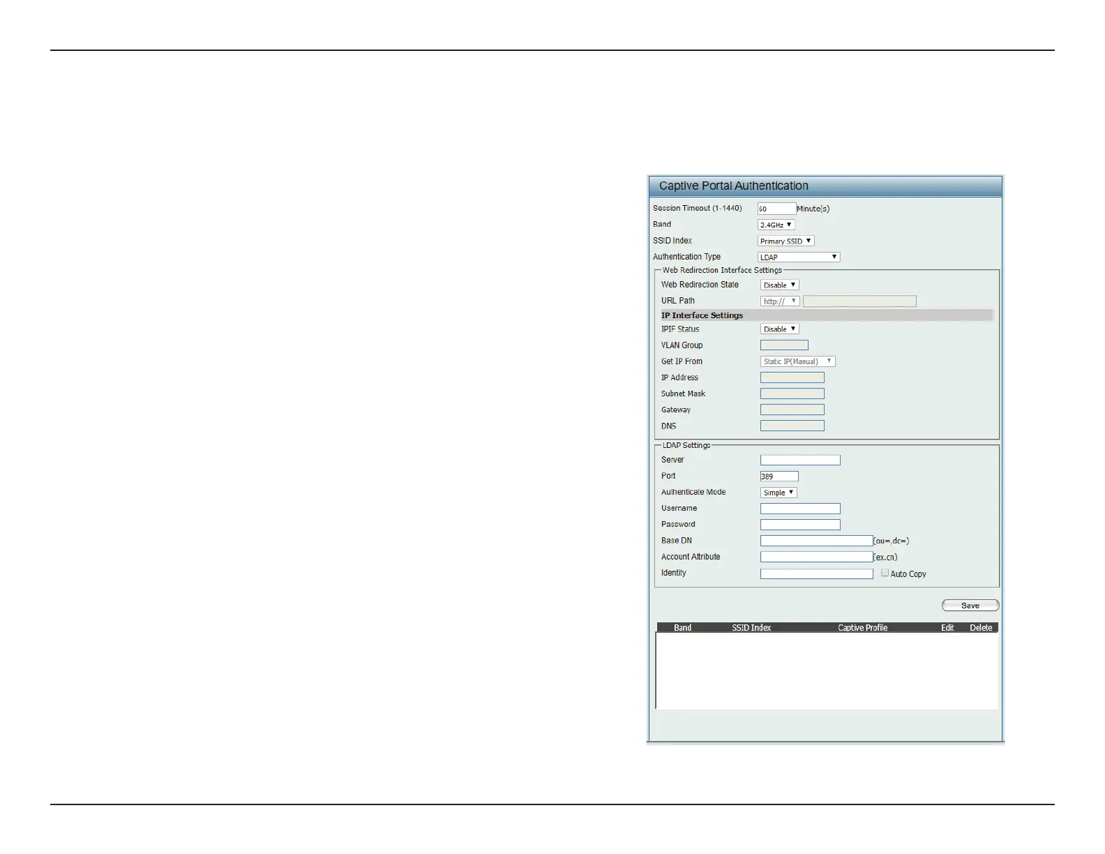 page. In this window, users can view and congure the Captive Portal settings. After selecting LDAP as the Authentication Type, we can congure