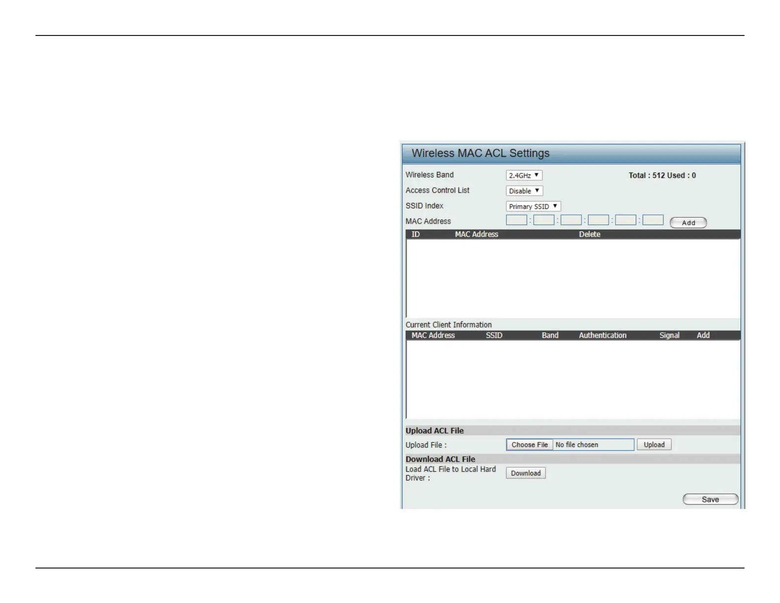 This page allows the user to congure Wireless MAC ACL settings for access control.