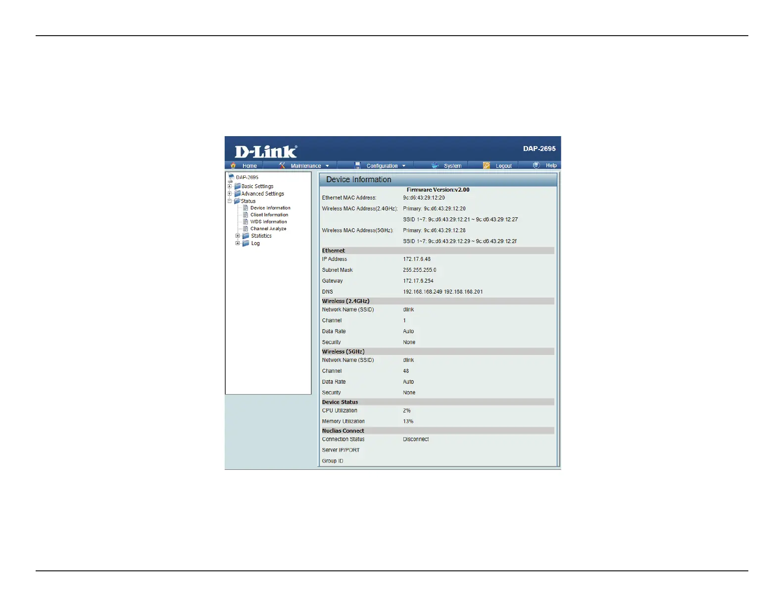 In the Status Section the user can monitor and view conguration settings of the access point. Here the user can also view statistics about client