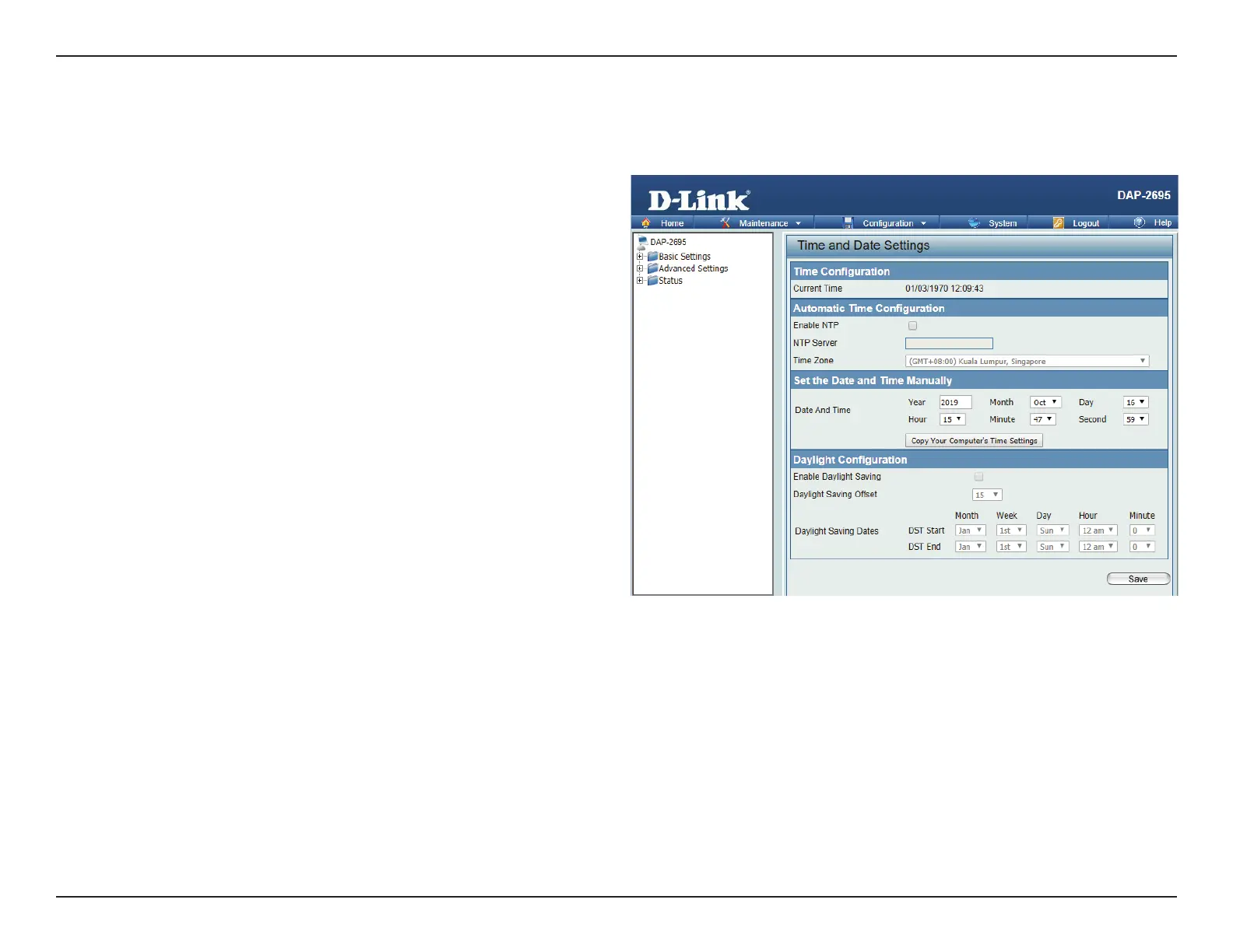 Enter the NTP server IP, choose the time zone, and enable or disable daylight saving time.