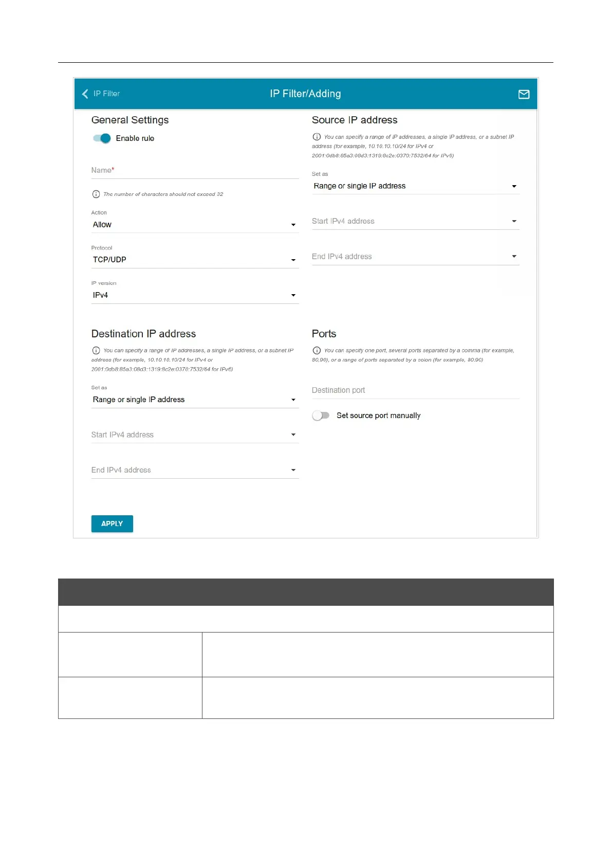 Figure 120. The page for adding a rule for IP filtering.