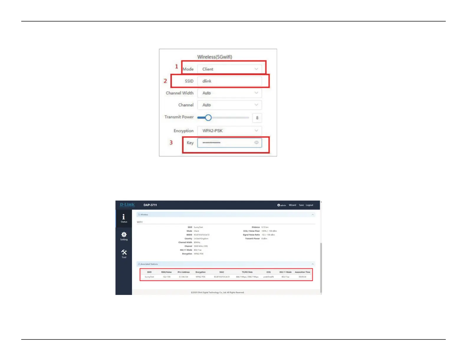 4. To conrm that wireless connectivity between the two devices is congured correctly, navigate to the Status page and check
