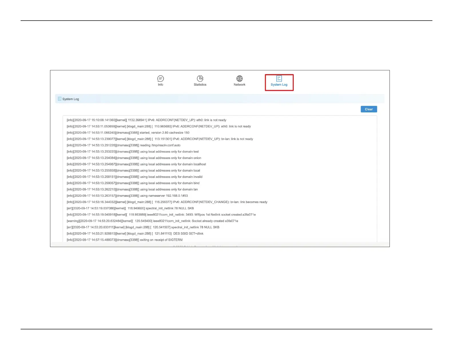 This tab shows the current syslog. Click the Clear button to Clear the log.