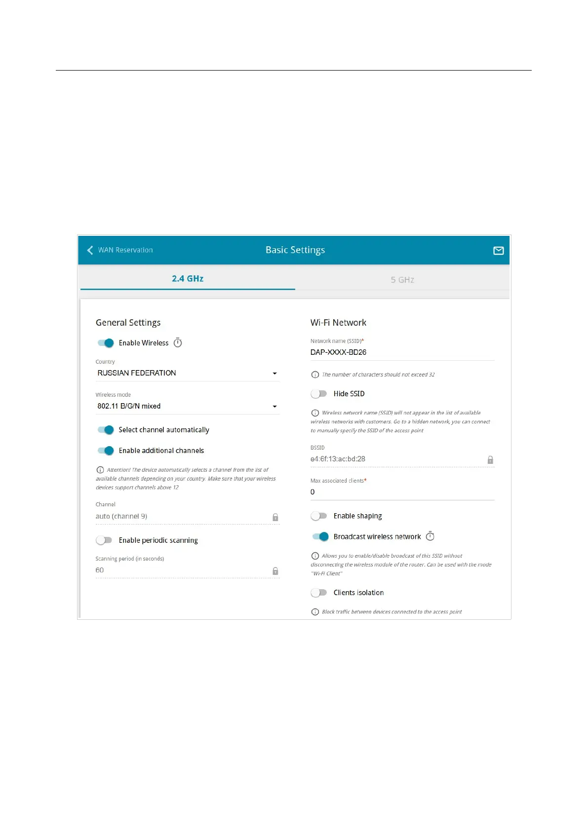 In the Wi-Fi / Basic Settings section, you can change basic parameters for the wireless interface