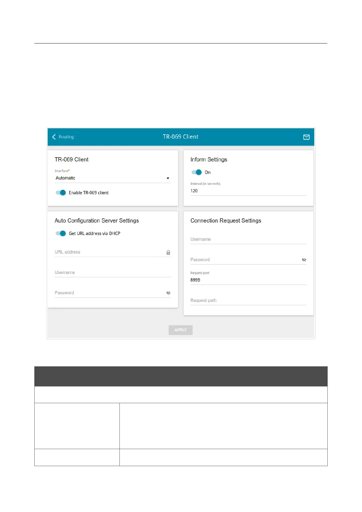 Enable TR-069 client Move the switch to the right to enable the TR-069 client.