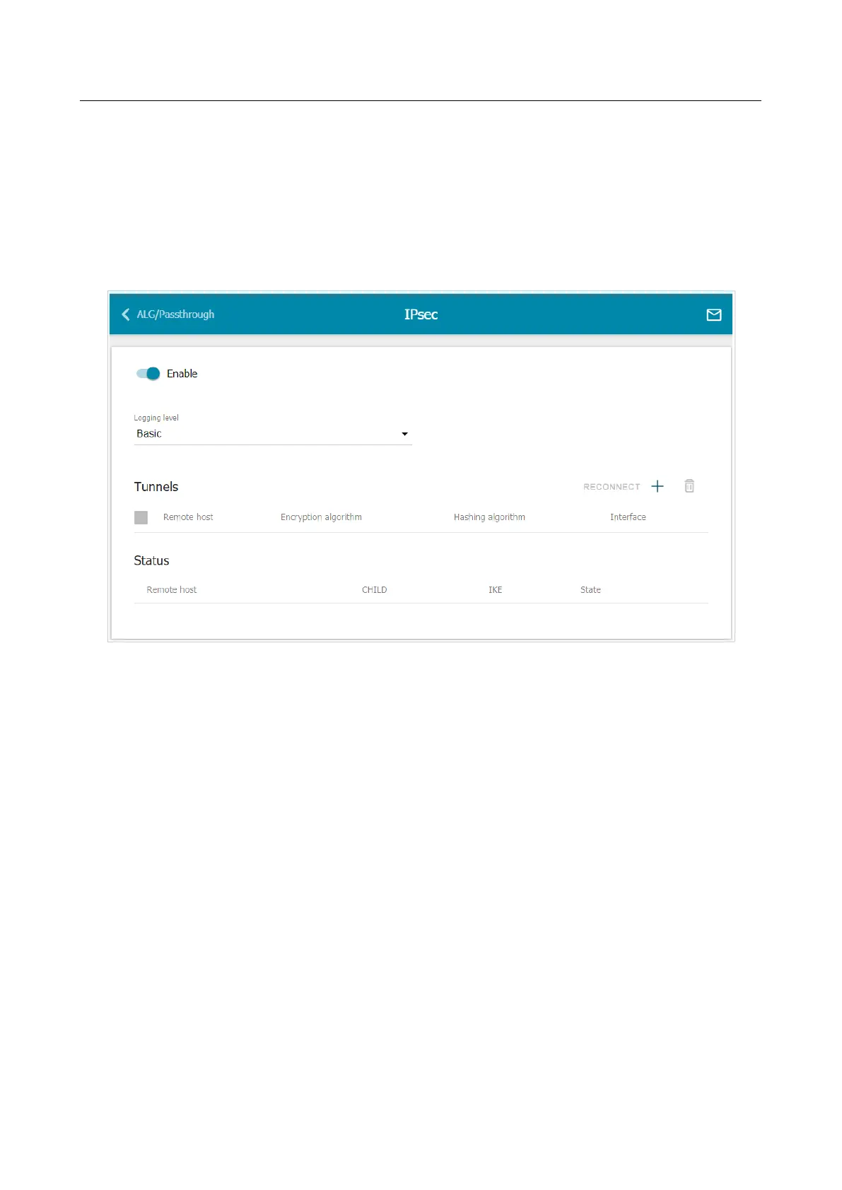 To allow IPsec tunnels, move the Enable switch to the right. Upon that the Tunnels and Status