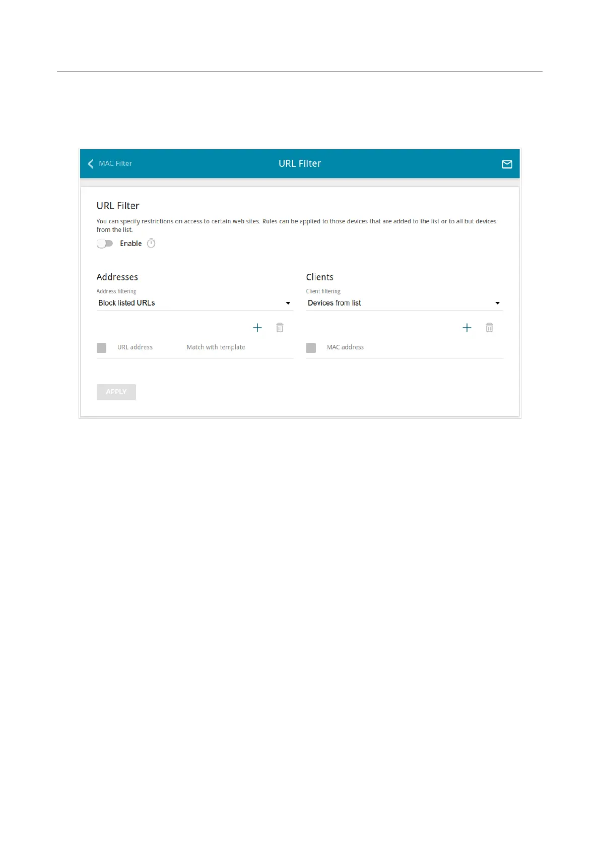 To enable the URL filter, move the Enable switch to the right, then select a mode from the