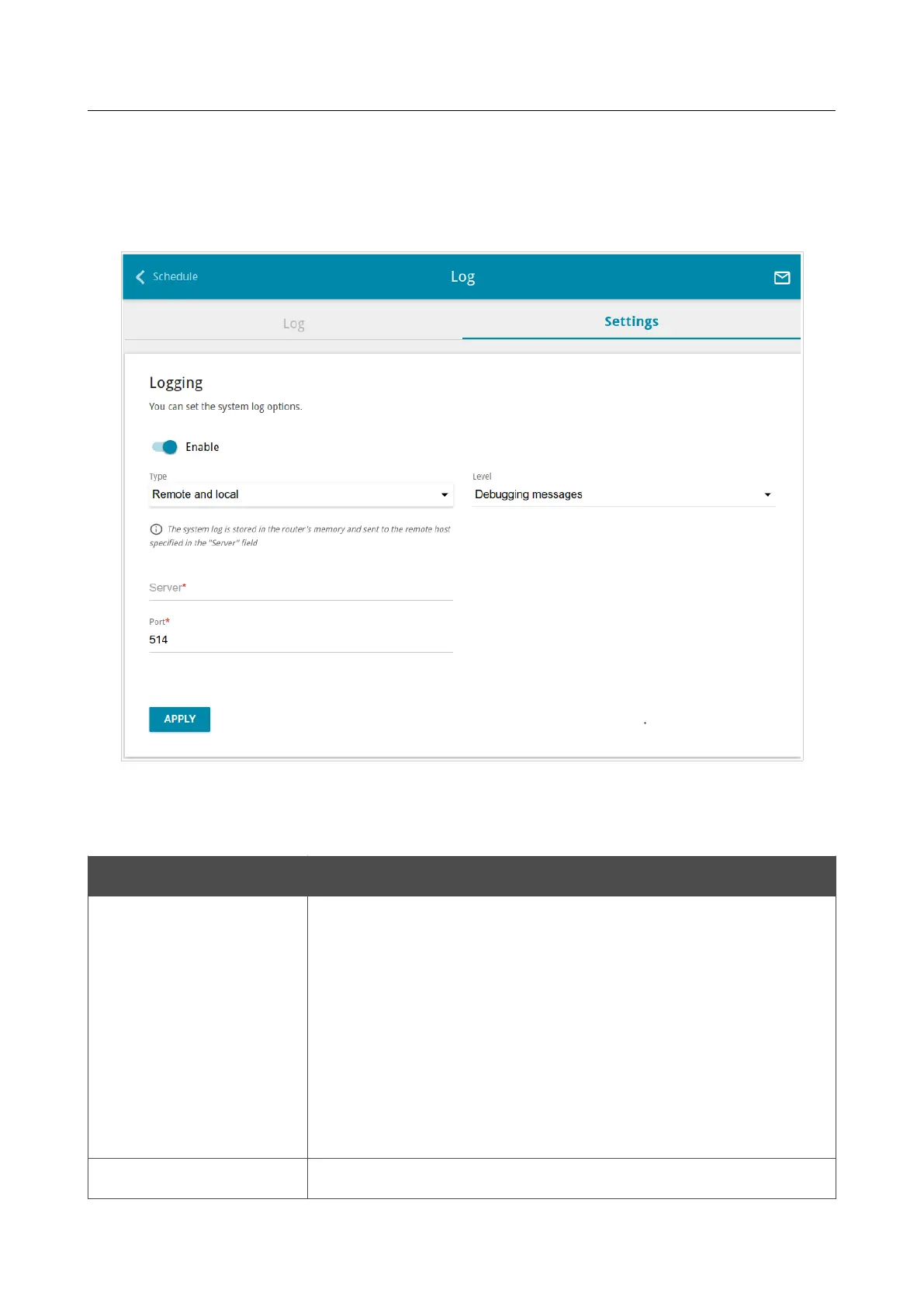 • Remote: The system log is sent to the remote host specified