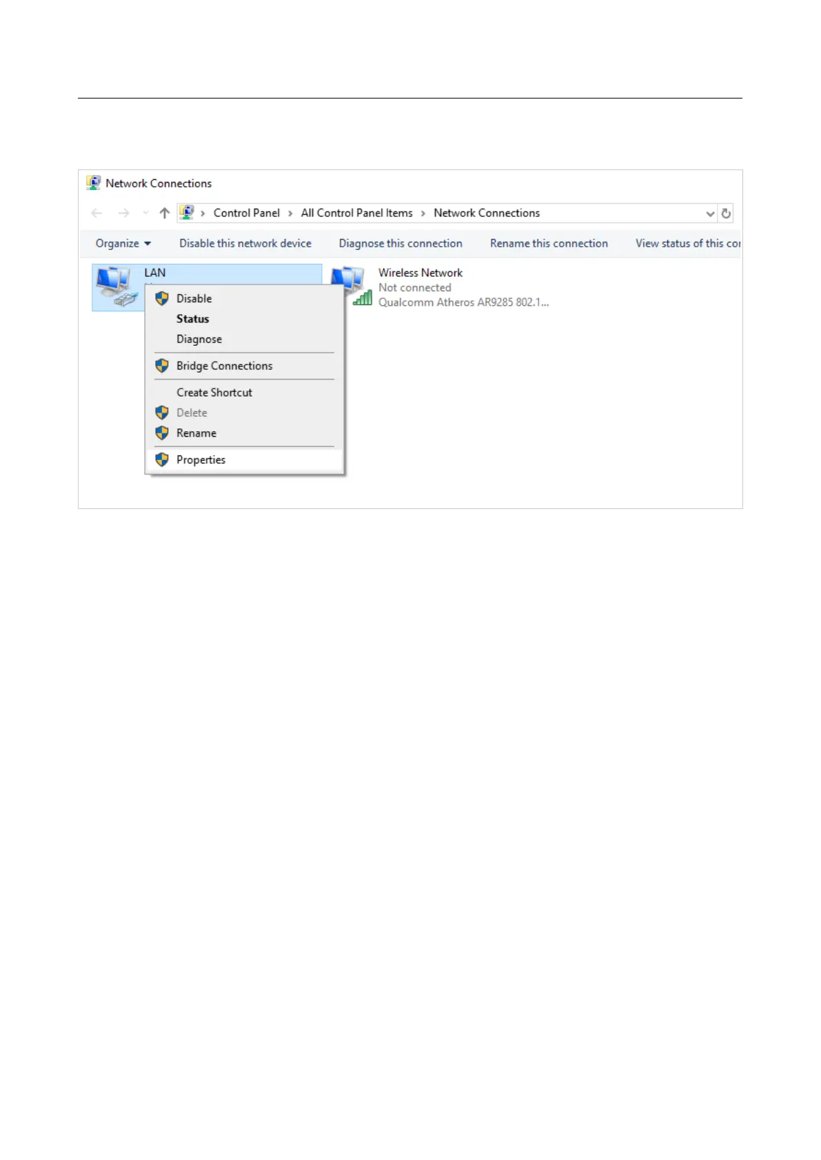 4. In the opened window, right-click the relevant Local Area Connection icon and select
