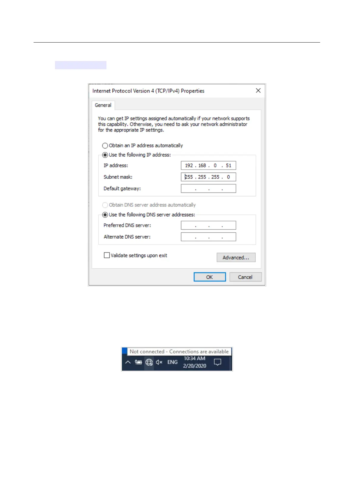 6. Select the Use the following IP address radio button and enter the value