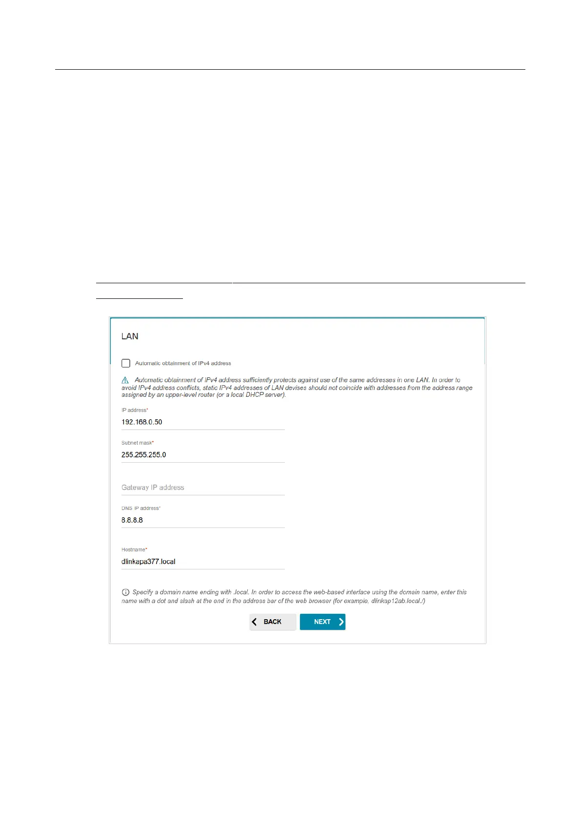If you want to manually assign the LAN IPv4 address for DAP-600P, do not select the Automatic