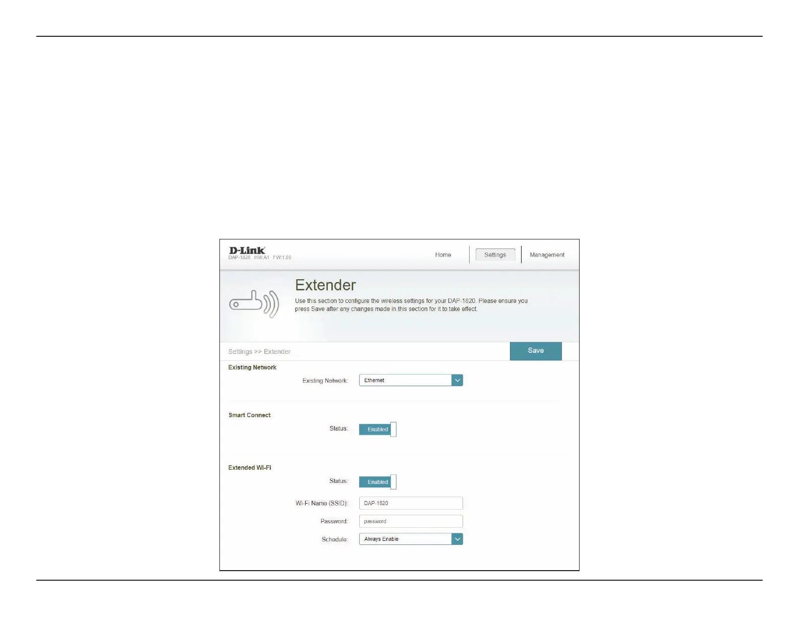 To access this page, click the Settings drop-down menu at the top of the page, and select Extender. Click Save to apply the settings