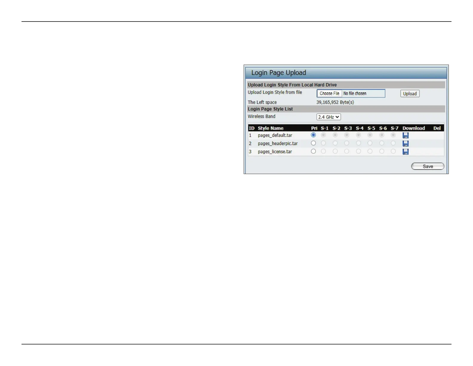 In this window, users can upload a custom login web page that will be used by the captive portal feature. Click the Browse button to navigate to