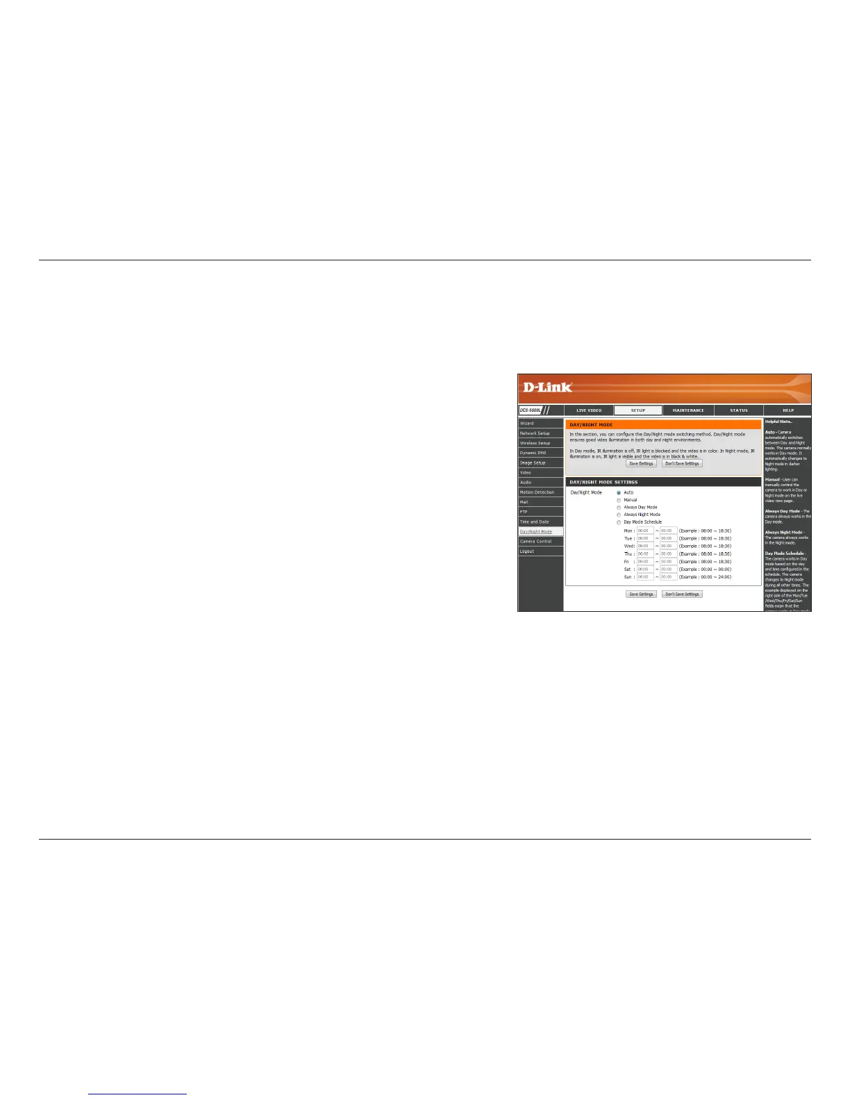This section allows you to congure when Day and Night modes are used. Day mode uses the infrared cut lter to provide a corrected color image