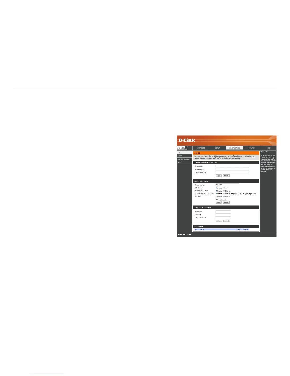 This section allows you to change the administrator’s password and congure the settings for your camera. The administrator can also create user