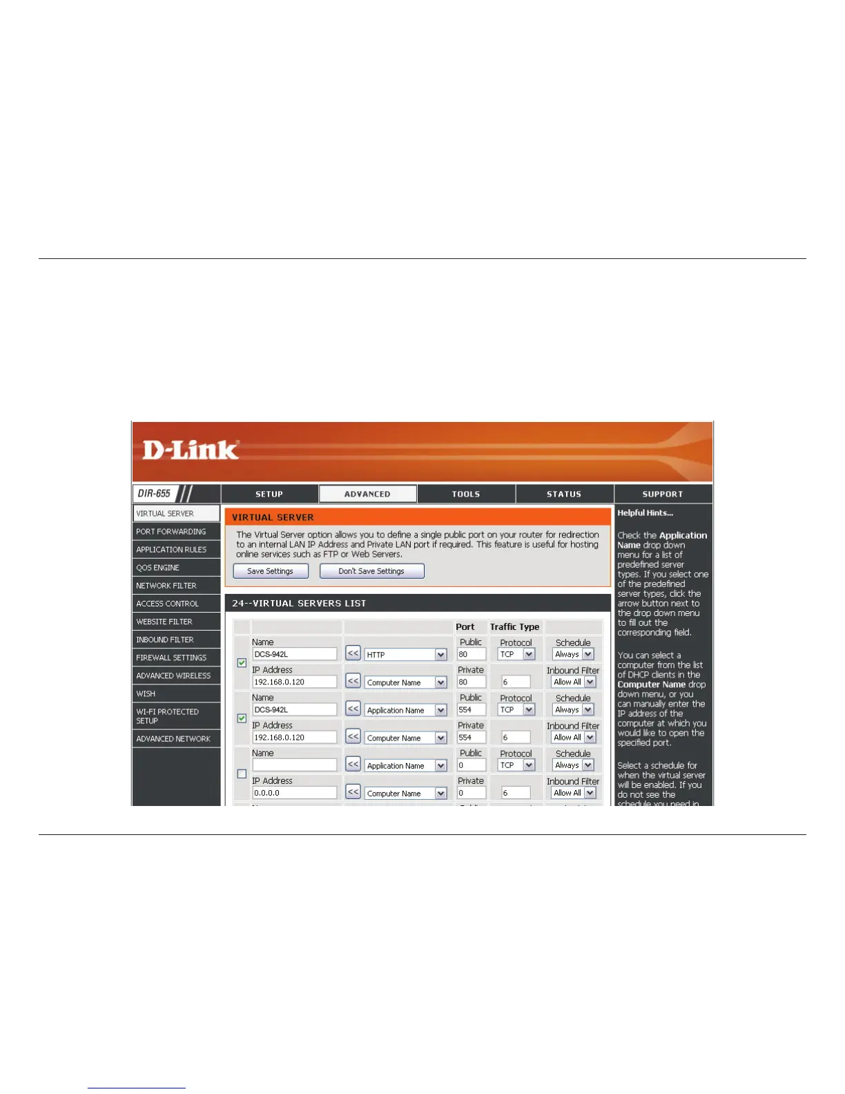 Enter valid ports in the Virtual Server section of your router. Please make sure to check the box next to the camera name on the Virtual Server List